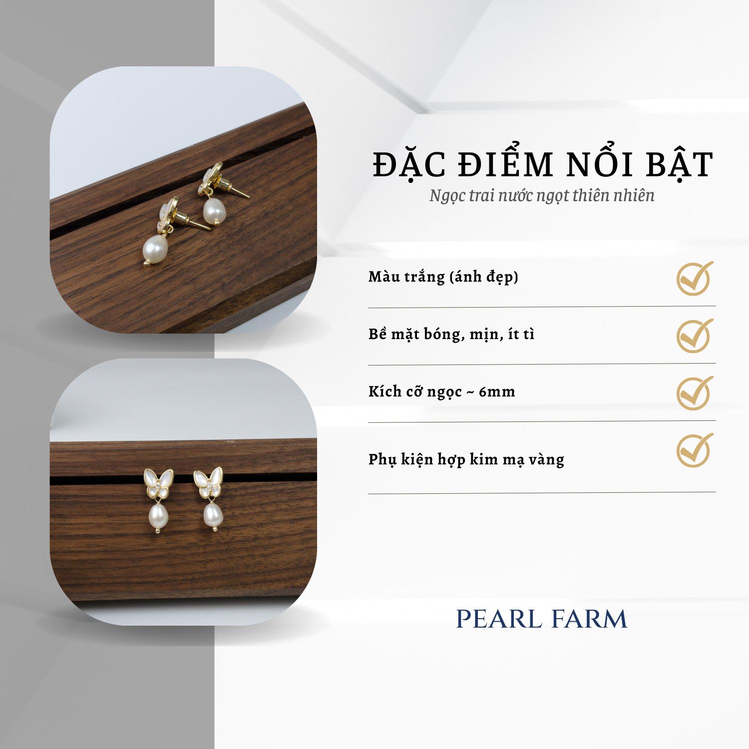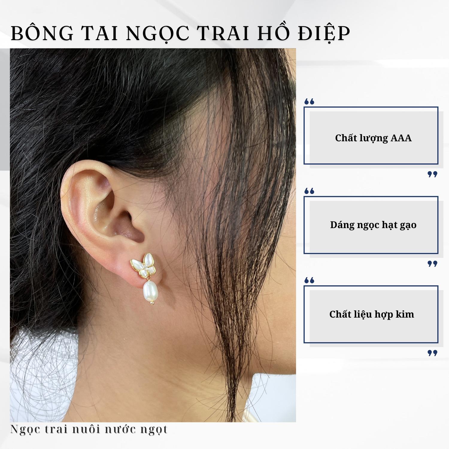 Bông tai làm từ hợp kim mạ vàng, chi tiết bướm hồ điệp nữ tính, thanh lịch. Ngọc trai dáng hạt gạo, kích cỡ khoảng 6mm.