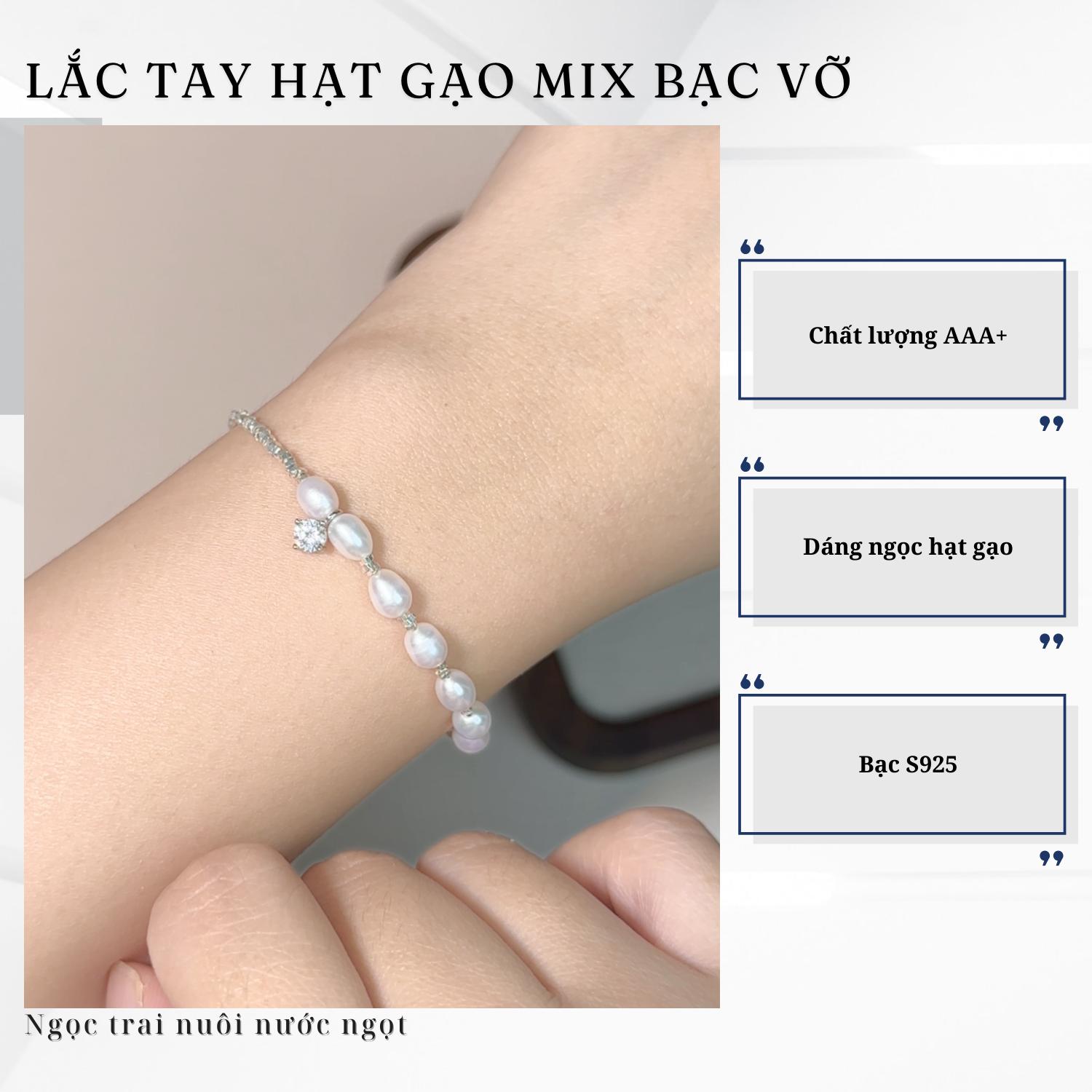 ✨ Lắc Tay Ngọc Trai Mix Bạc Vỡ Đính Đá Ngọc Hạt Gạo 5-6mm Trẻ Trung